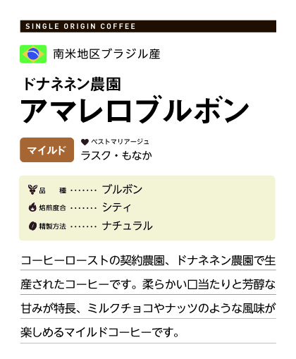柔らかい口当たり芳醇な甘みが特長、ミルクチョコナッツのような風味が楽しめるマイルドコーヒーです。
