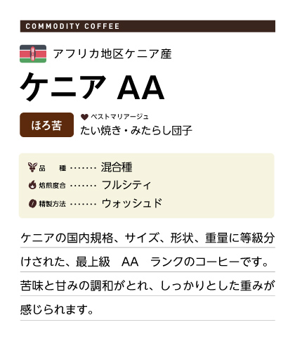 ケニアの国内規格、サイズ、形状、重量に等級分けされた、最上級 AA ランクのコーヒーです。